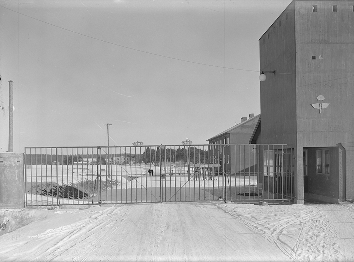 Grindar och vaktbyggnad vid ingången till F 2 flygflottilj. Vintertid.