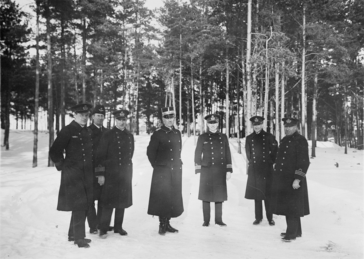 Grupporträtt av sju officerare ur marinen och flygvapnet framför ett skogsparti, vintertid