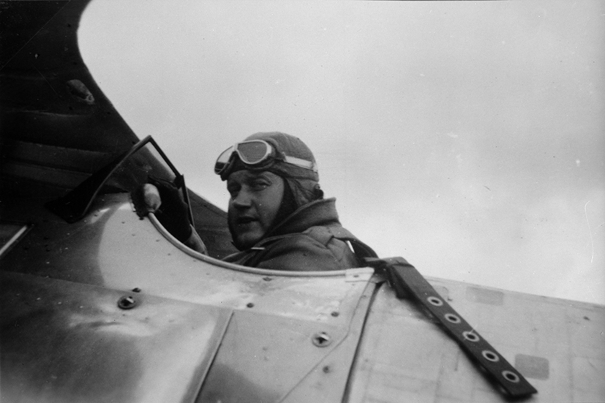 Flygförare Torsten Rapp i förarsäte på flygplan
