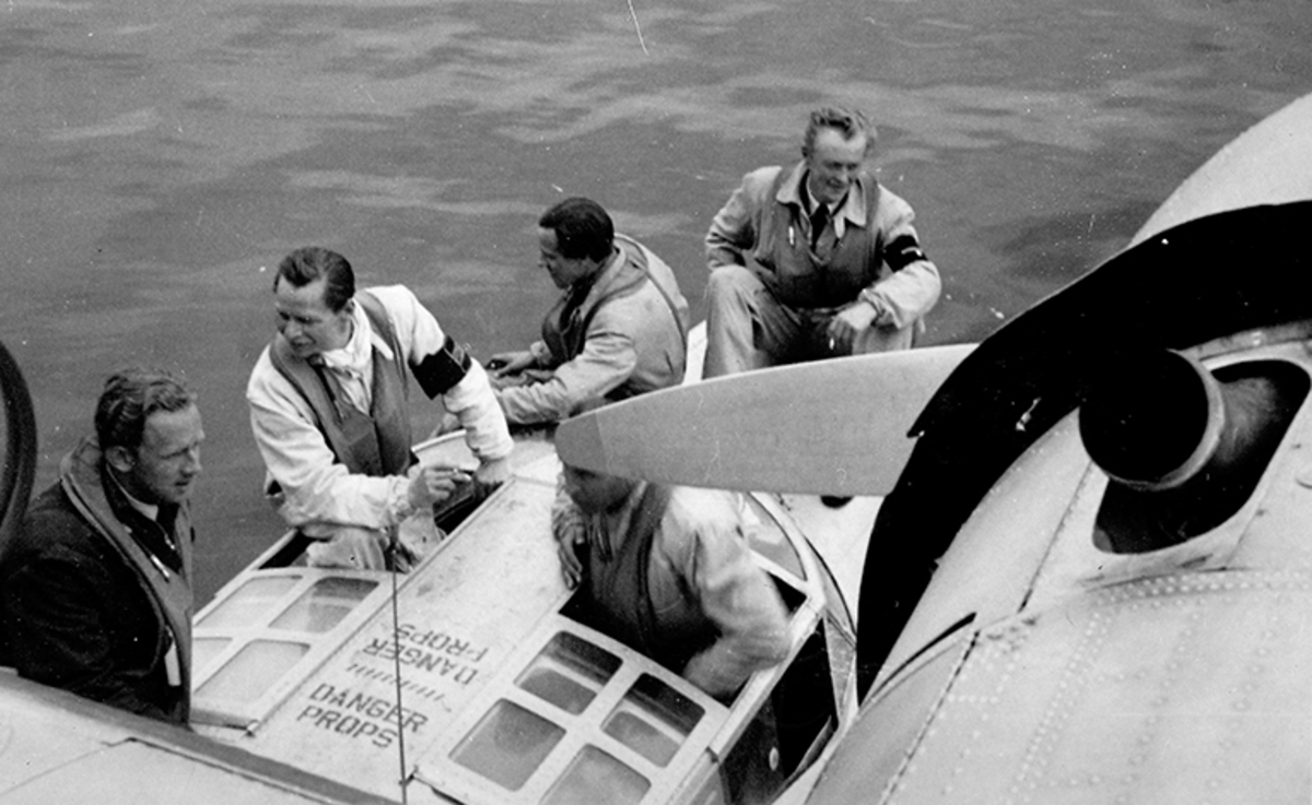 Besättning kliver ur flygplan Tp 47 genom kabinfönster.