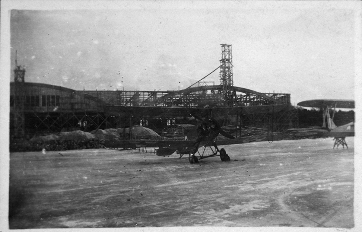 Flygplan Avro 504 uppställd framför hangarer under byggnation på Hägernäs.