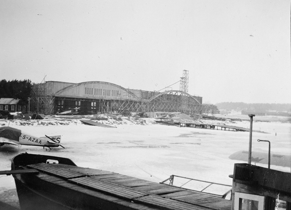 Hangar byggs på F2. I förgrunden en båt samt ett civilregistrerat flygplan Junkers F 13.