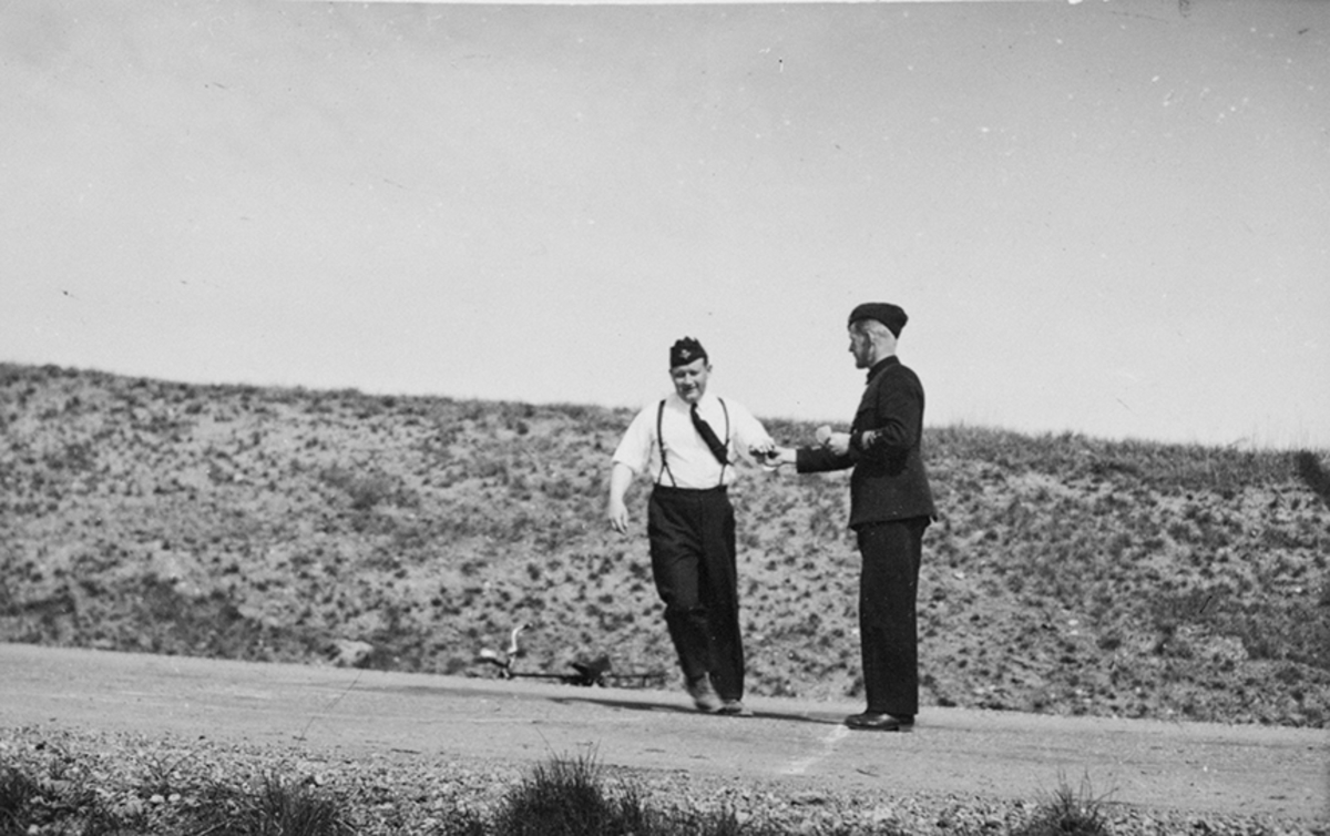 Torsten Rapp samt okänd man på en väg. Torsten Rapp springer. En cykel i bakgrunden.