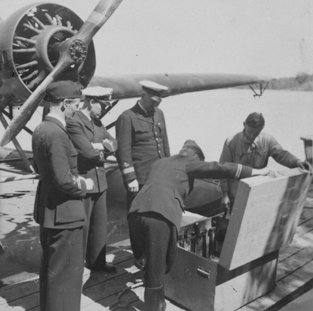 Fem män står runt en låda med verktyg framför ett flygplan.