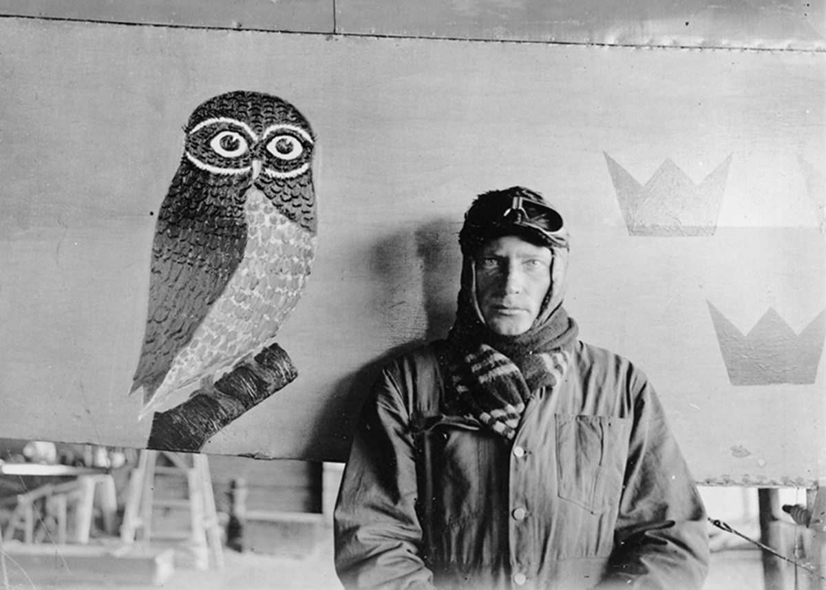 En man i flygarutrustning står framför ett flygplan med en målad uggla.