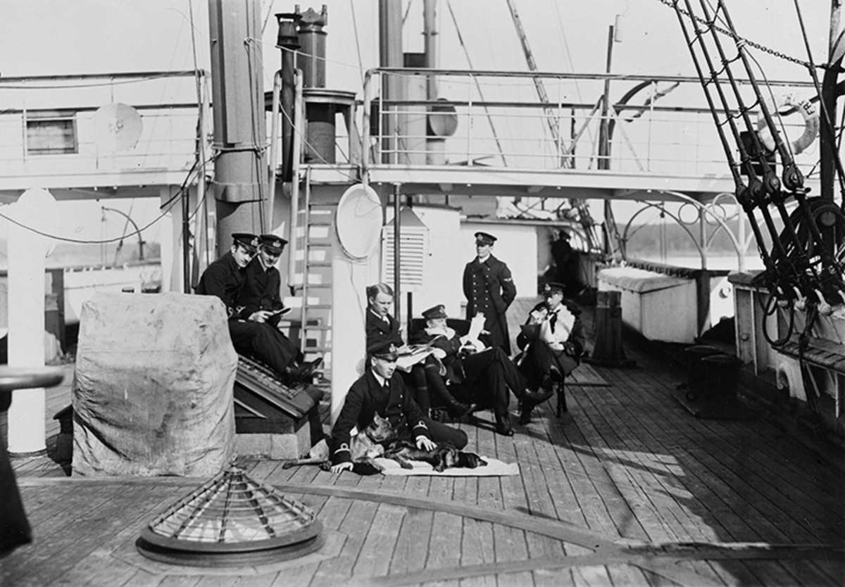 Sju officerare ur marinen och några hundar sitter på däck på fartyget Freja i Hägernäsviken.