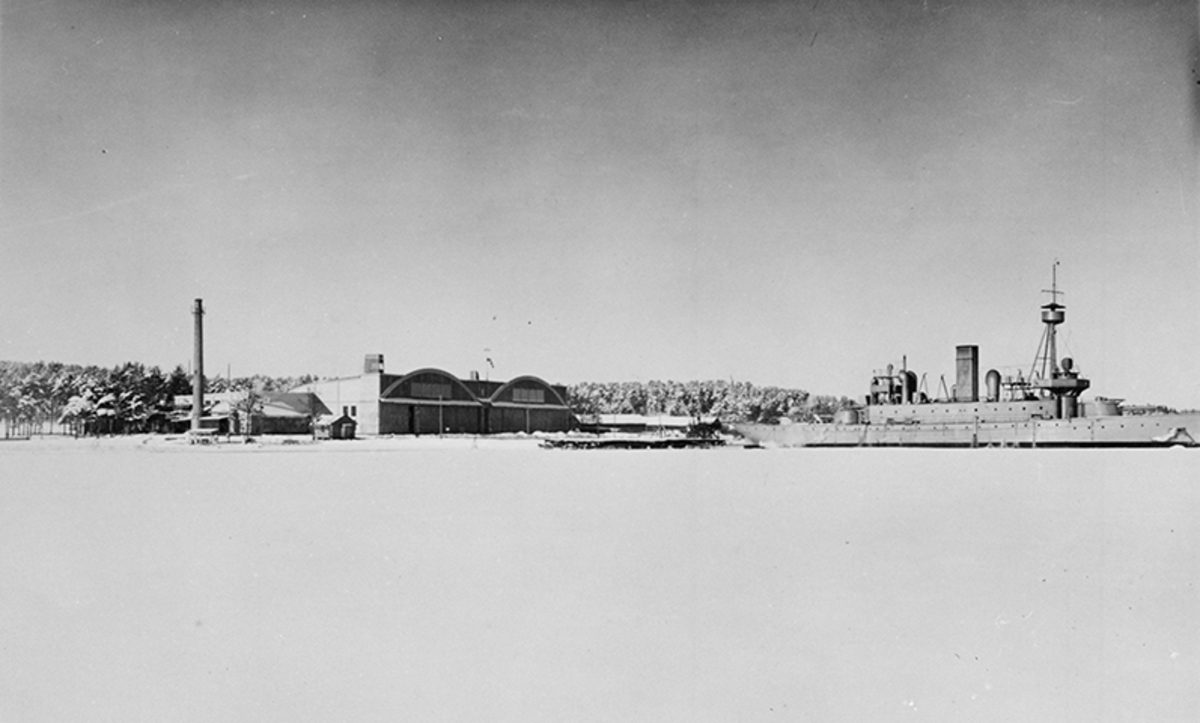 Flygflottiljen F 2 vid Hägernäsviken om vintern, sett från isen. I mitten syns hangarer och till höger ligger ett fartyg förtöjt.