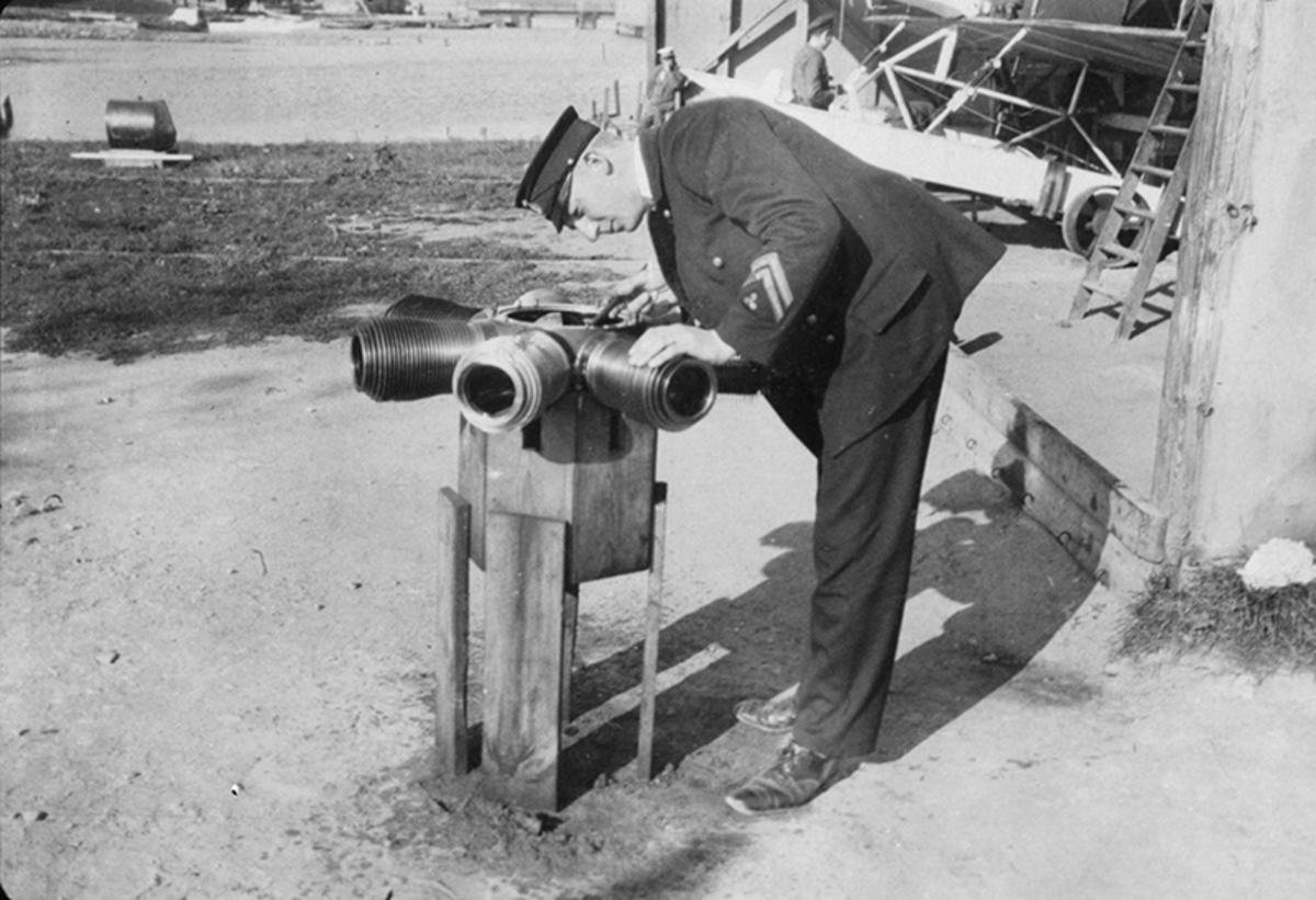 En man inspekterar en stjärnmotor. I bakgrunden en hangar med ett flygplan.