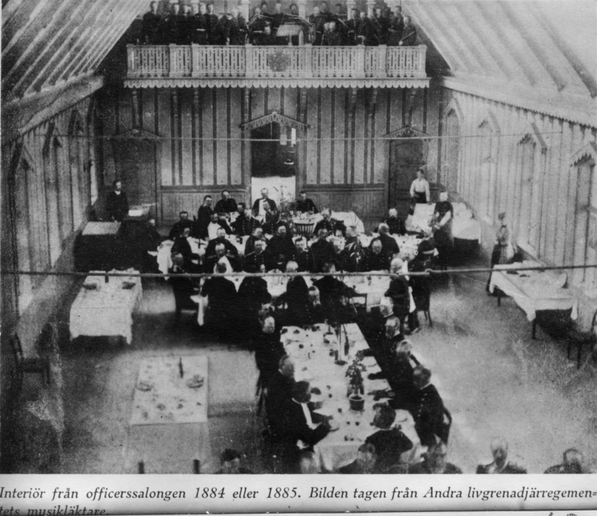 Interiör av officersalongen på Malmen vid middag. Avfotografering av bild ur tryck.