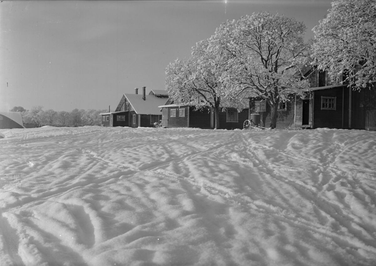 Baracker på F 3 Östgöta flygflottilj på Malmen under vintertid. Barackerna nr. 32, 33, 34, exteriör.
