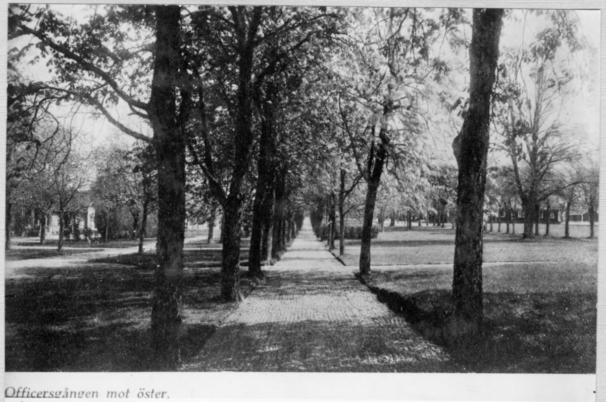 Officersgången mot öster på regementet på Malmen. Miljöbild. Avfotografering av bild ur tryck.
