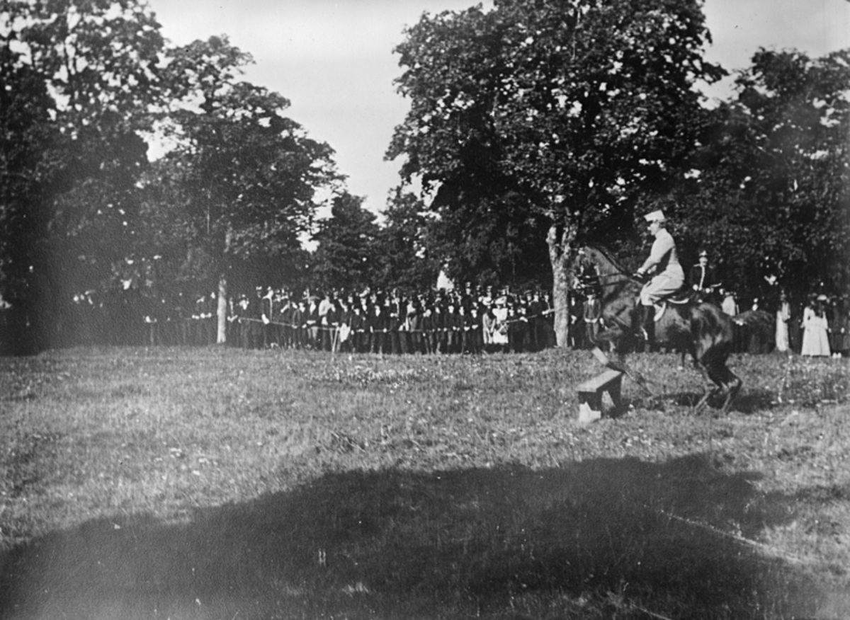 Militär utövar hästhoppning framför publik på regementsområdet Malmen.