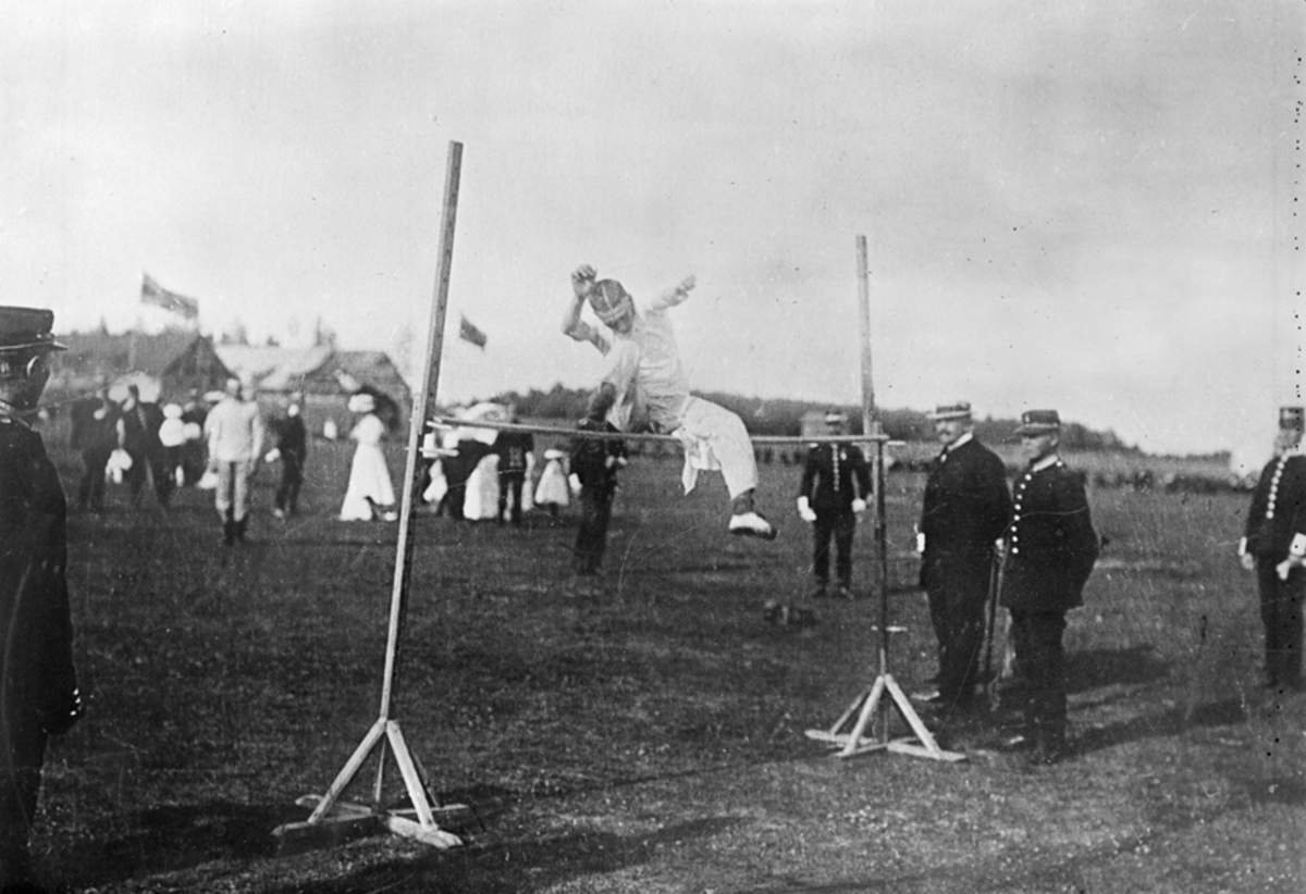 Höjdhoppning på livgrenadjärrgementet på Malmen. Åskådare i bakgrunden.