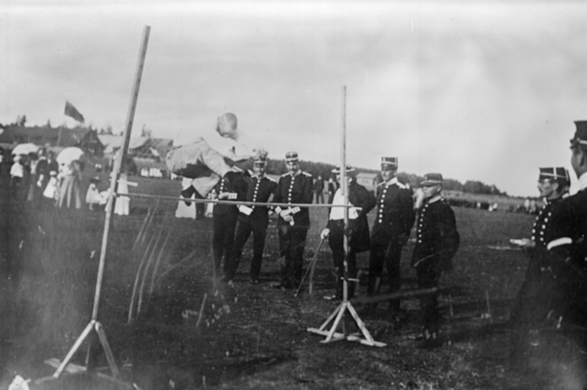 Höjdhoppning på livgrenadjärrgementet på Malmen. Åskådare i bakgrunden.