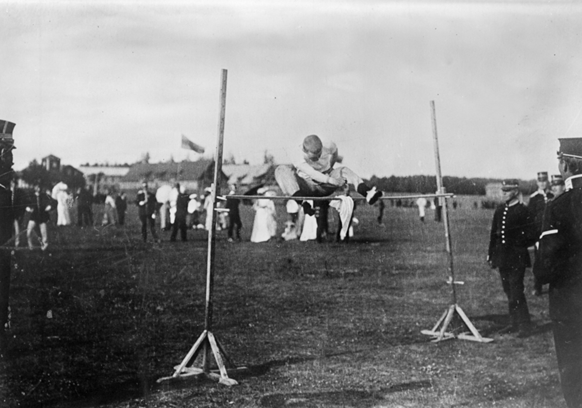 Höjdhoppning på livgrenadjärrgementet på Malmen. Åskådare i bakgrunden.