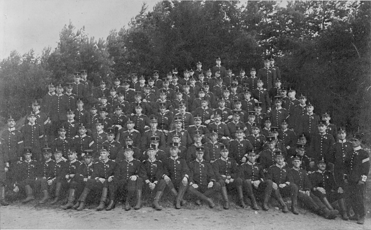 Grupporträtt av ett kompani på Malmen. Avfotografering av bild ur tryck.