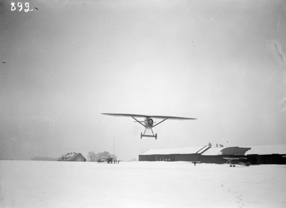 Flygplan FVM J 23 flyger lågt över Malmen, vintertid.