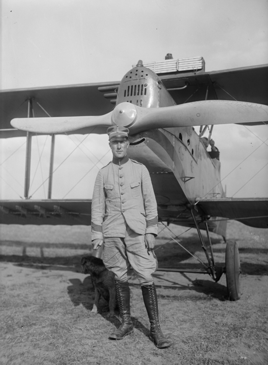 Porträtt av löjtnant Helge Palmblad vid flygplan på Malmen.