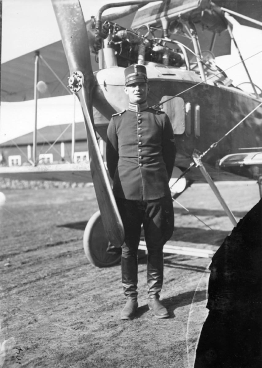Porträtt av löjtnant vid I 12 framför flygplan Albatros BIIA.