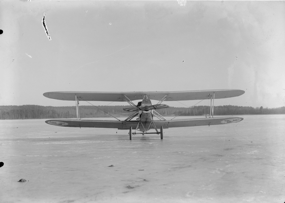 Flygplan Sk 4 står uppställt på isen. I bakgrunden syns ett skogsparti.