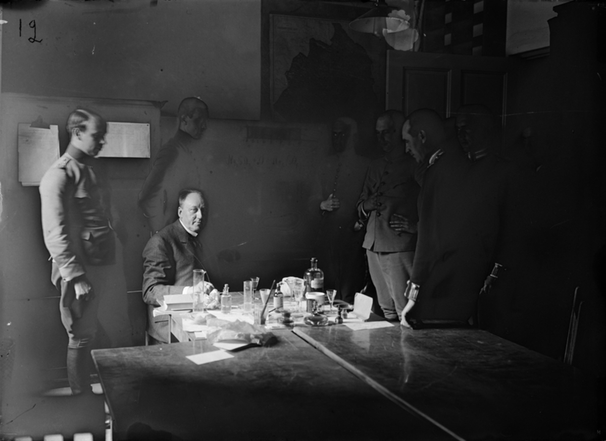 Lärare och elever på spanarskolan på kontor på Malmen. Överexponerad bild.