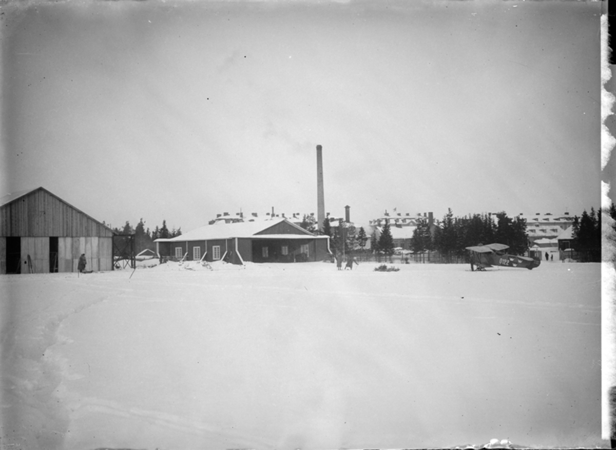 Flygstationen i Boden. Byggnader, hangarer och flygplan Phönix E1 märkt 0122.