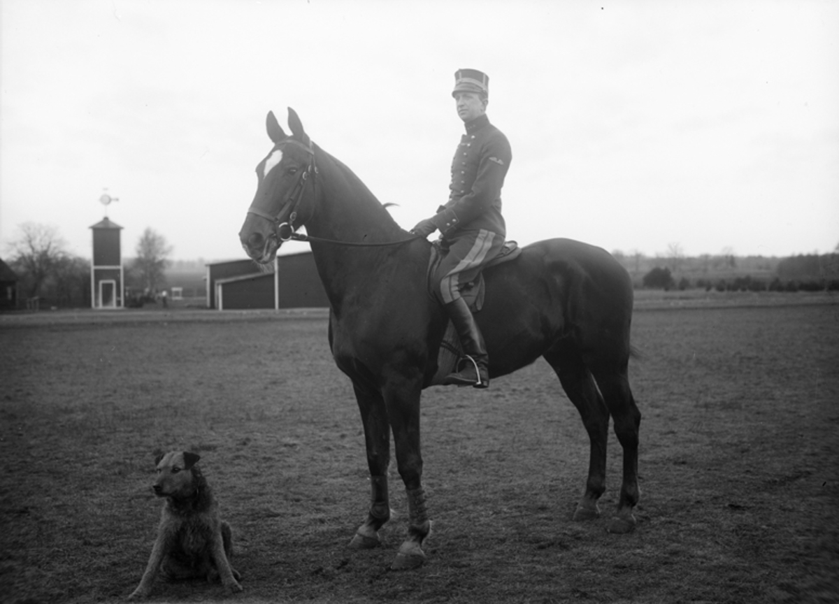 Porträtt. Kapten Lundström till häst. I förgrunden sitter en hund.