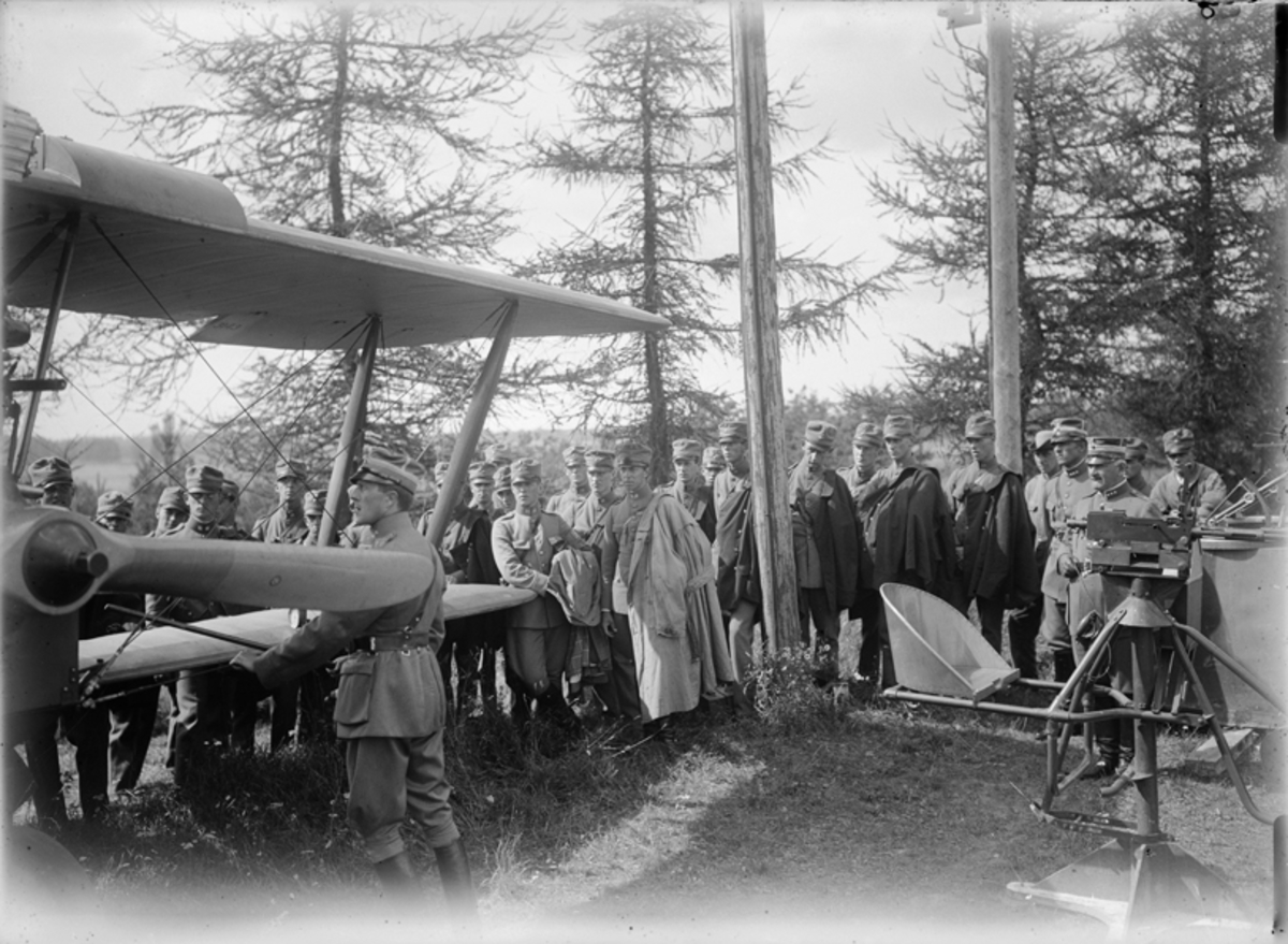 Prins Gustaf Adolf besöker Malmen. Förevisning av kulspruta i flygplan.