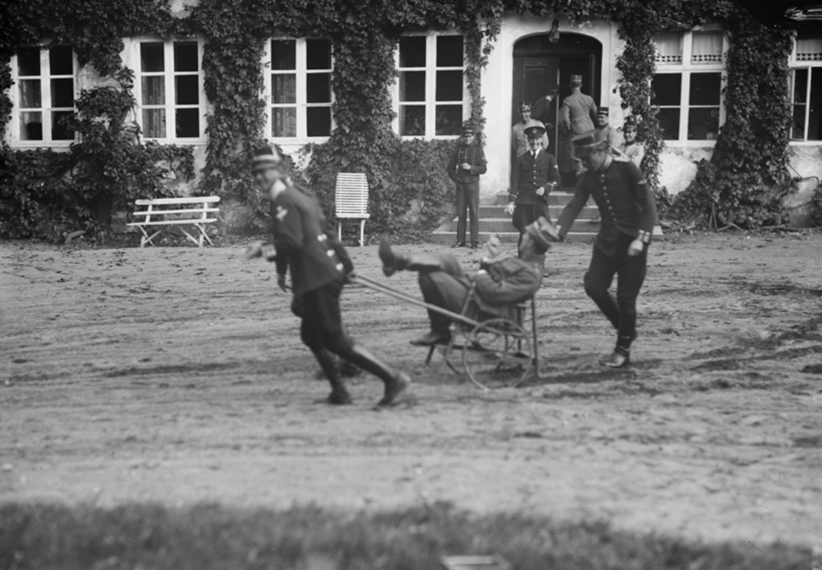 En man dras fram i barnvagn av kamrater. Fyra män roar sig och underhåller kamrater.