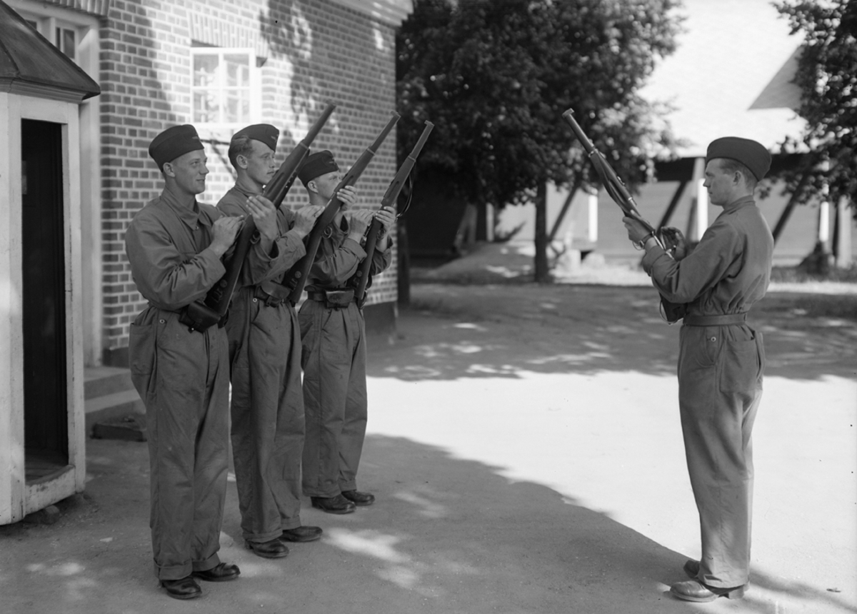 Flygkårens lägervakt står uppställd med vapen framför en byggnad.
