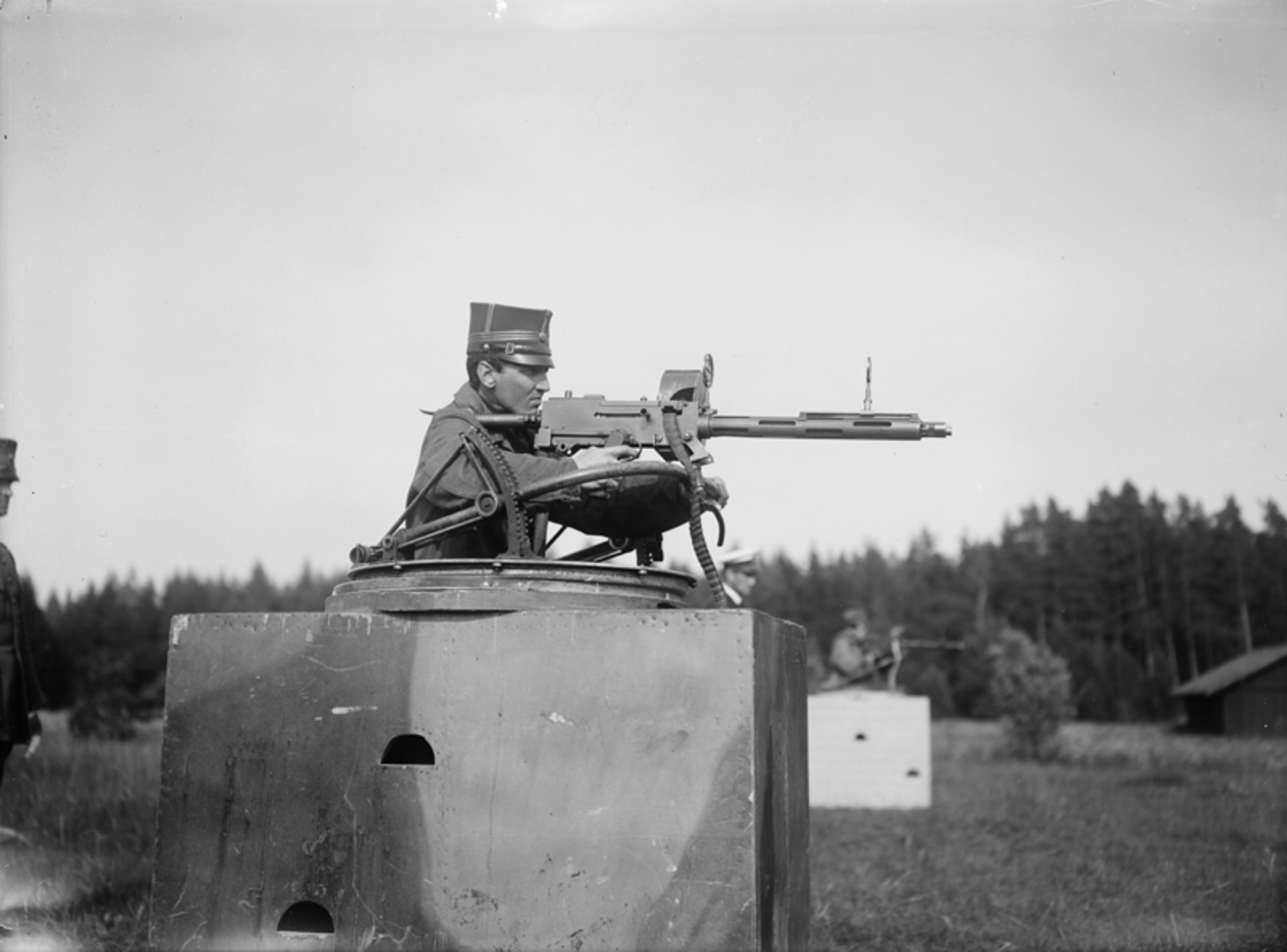 Övning. Skjutning med kulspruta mot måltavla på F 3 Malmen. Man vid kulspruta.
