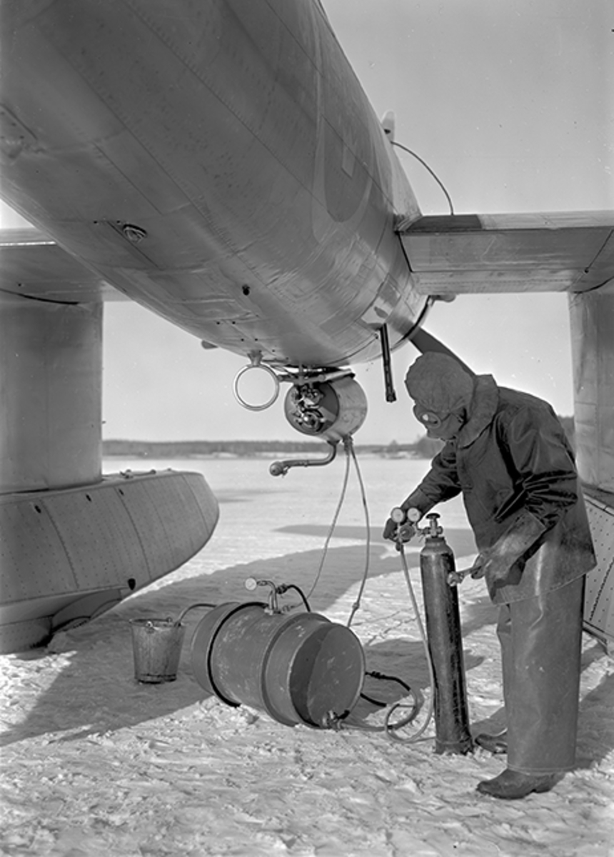 Påfyllning av dimbildare på flygplan S 17. Gastub ansluts.