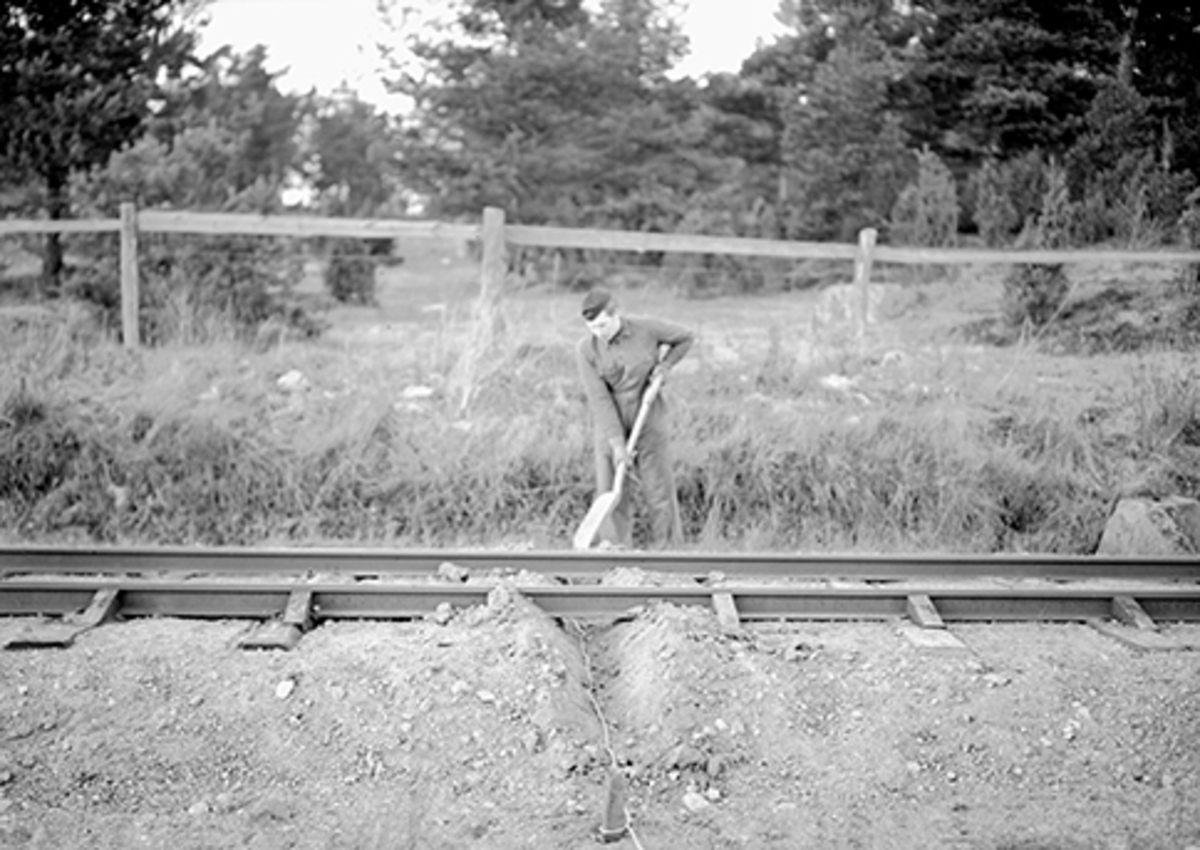 Telekabel dras under räls på F 2 Hägernäs, 1944. Man i arbete.