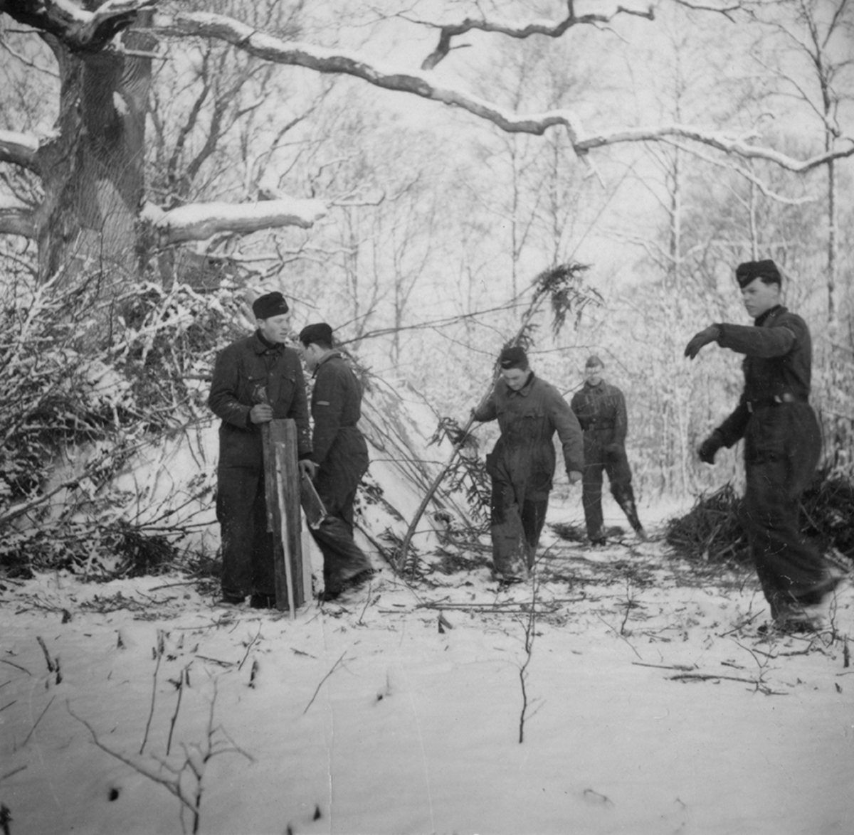 Kamouflering av bivack, nattläger. Fem soldater i kamouflagearbete. Under övning "Skånemanövern", 1939.