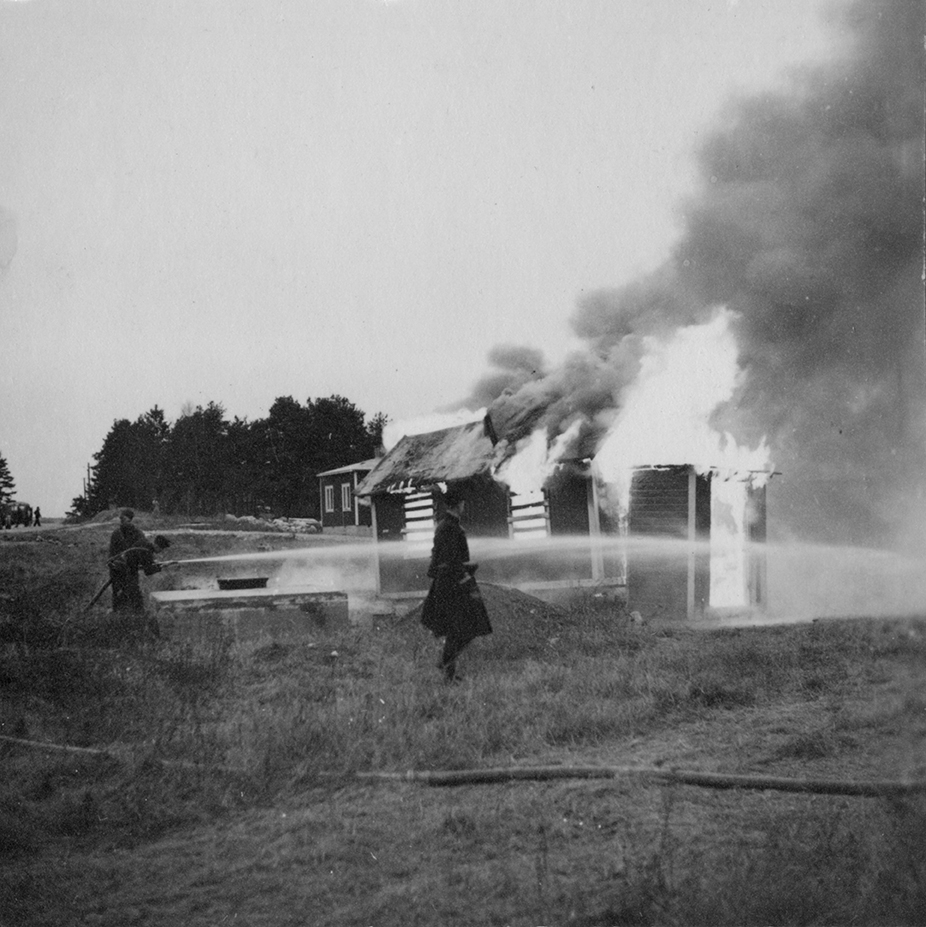 Brandövning, eldsläckning på F 2 Roslagens flygflottilj. Vattensläckning av uthus. Närbild.
