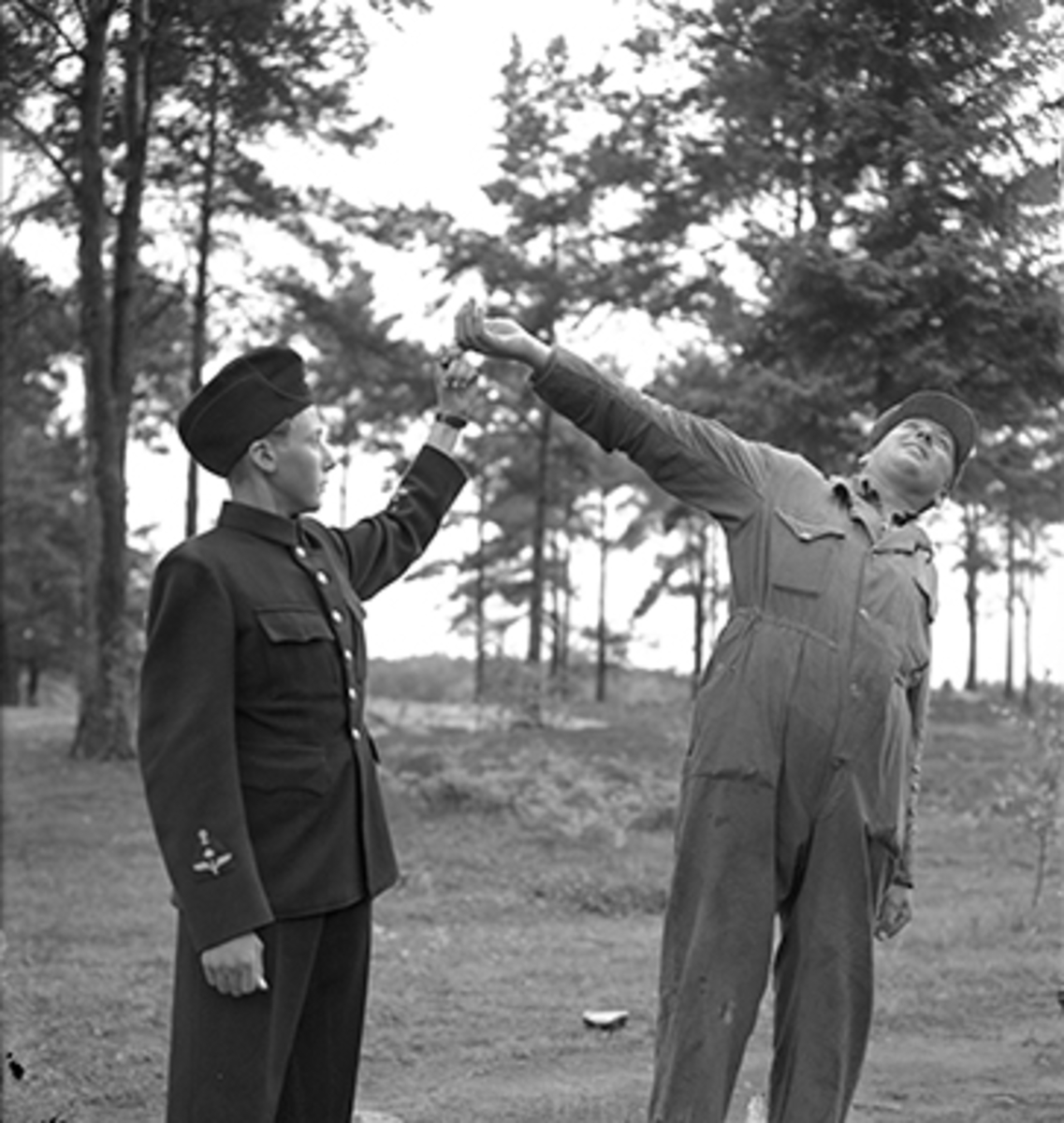 Förevisning av kampsport på F 2 Roslagens flygflottilj, 1940. Flygvapenungdom förevisar vridning av finger, utomhus.