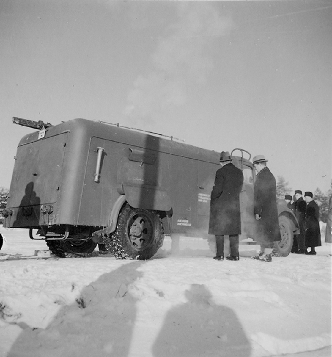Brandbil uppställd på väg på F 2 Roslagens flygflottilj. Folk omkring bilen.