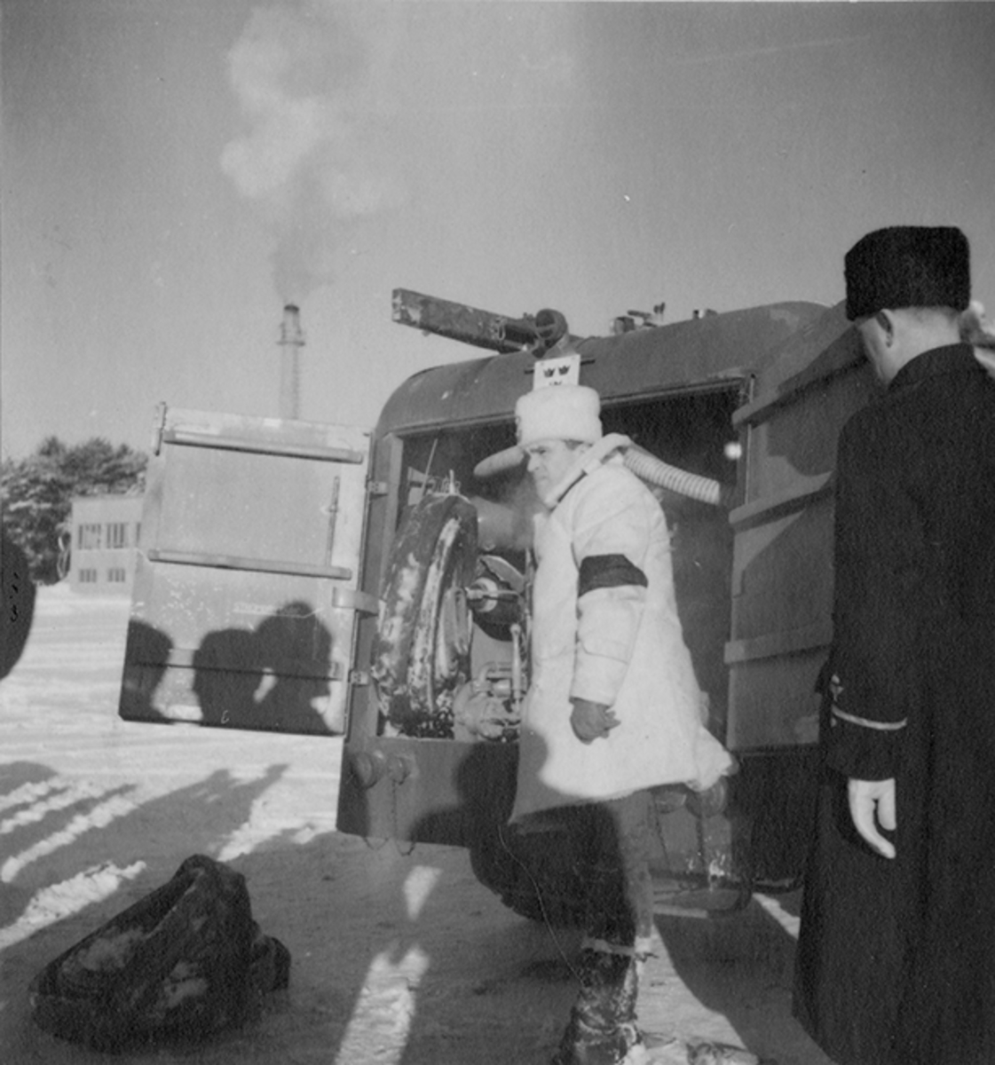 Brandbil på F 2 Roslagens flygflottilj. Öppnad baklucka, med personer framför.