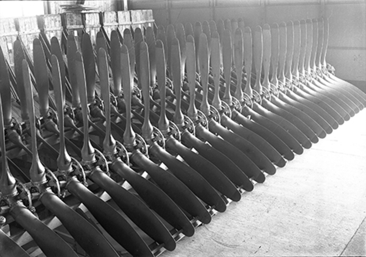 Flygplanspropellrar uppställda på rad på F 2 Roslagens flygflotilj.