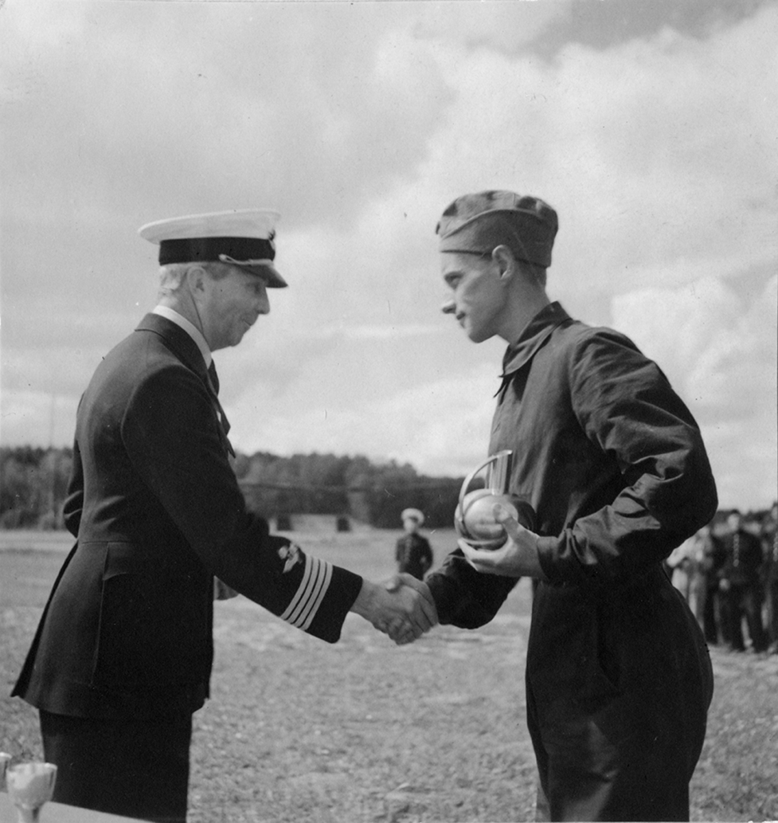 Prisutdelning på F 2 Roslagens flygflottilj, 1942. Herman Sundin, chef för F 2, delar ut pris till värnpliktig.