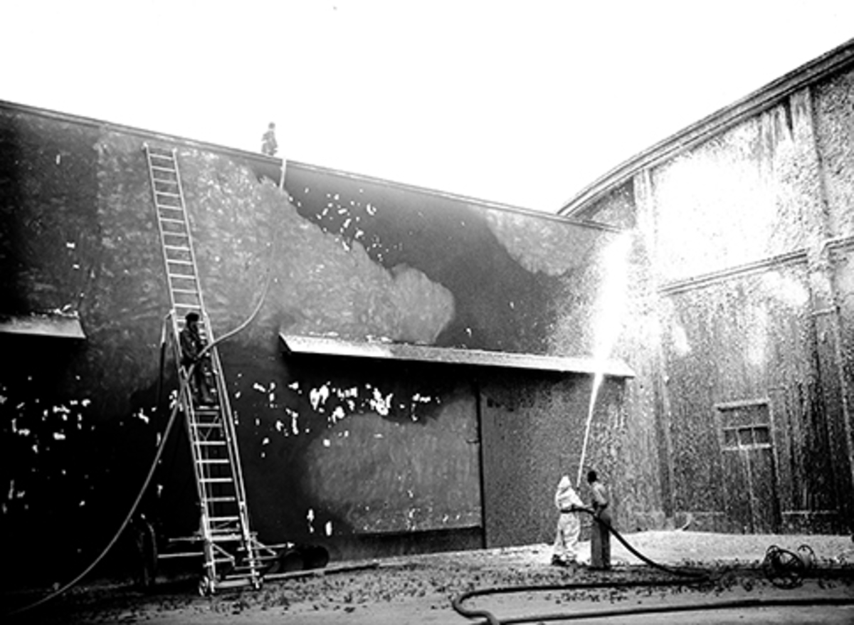 Släckningsarbete mot vägg vid brandövning på F 2 Roslagens flygflottilj.