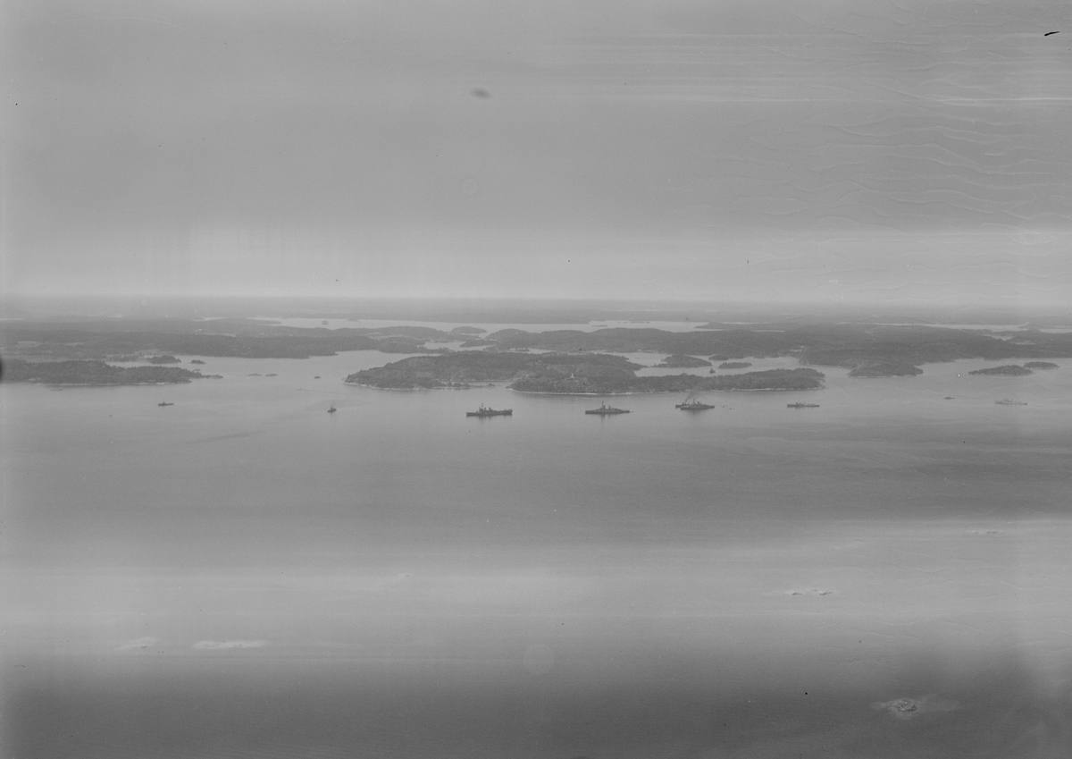 Flygfotografi av svenska örlogsfartyg till sjöss.