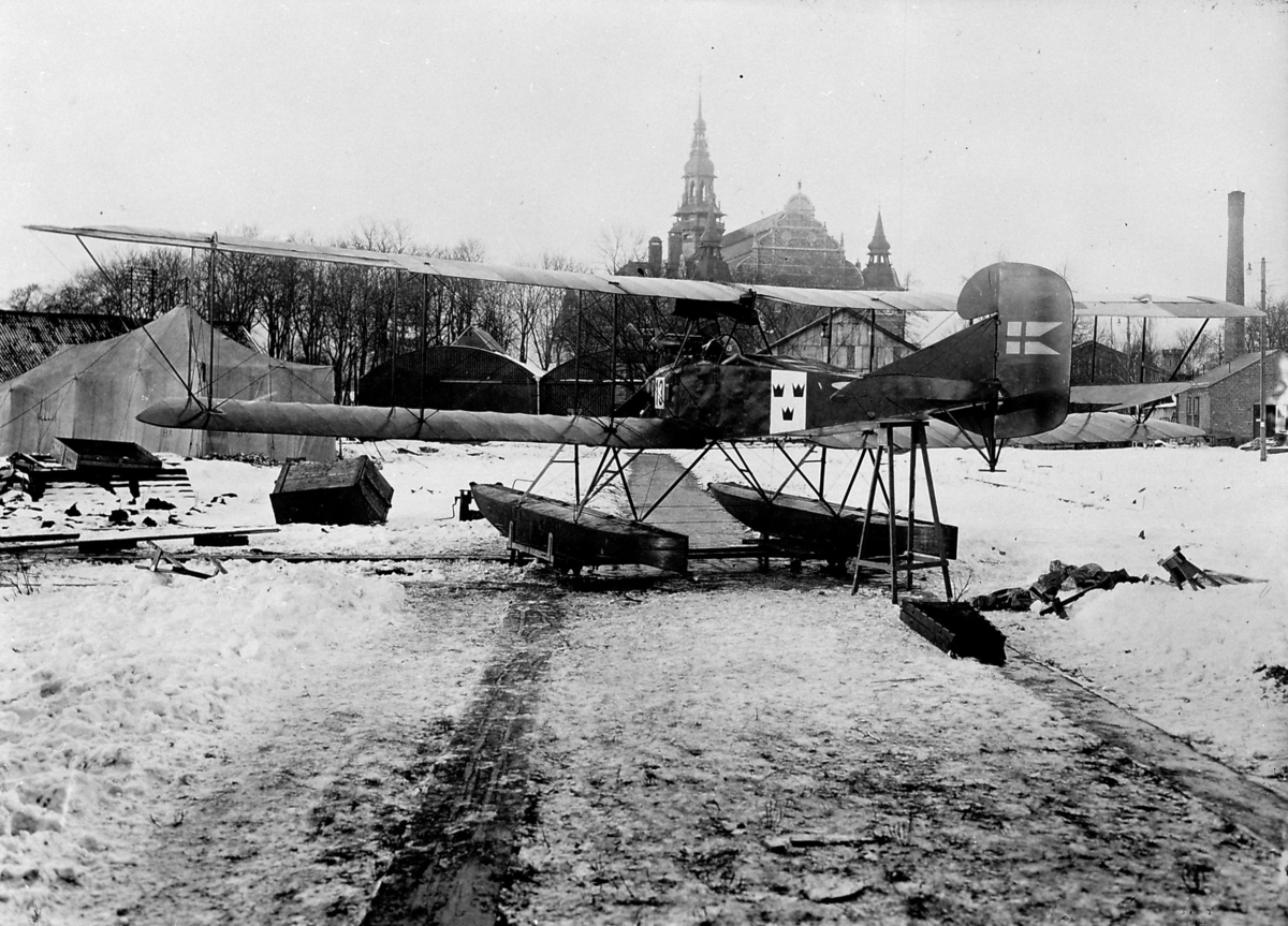 Uppställt flygplan Thulin G med flottörer på Galärvarvet, 1921.