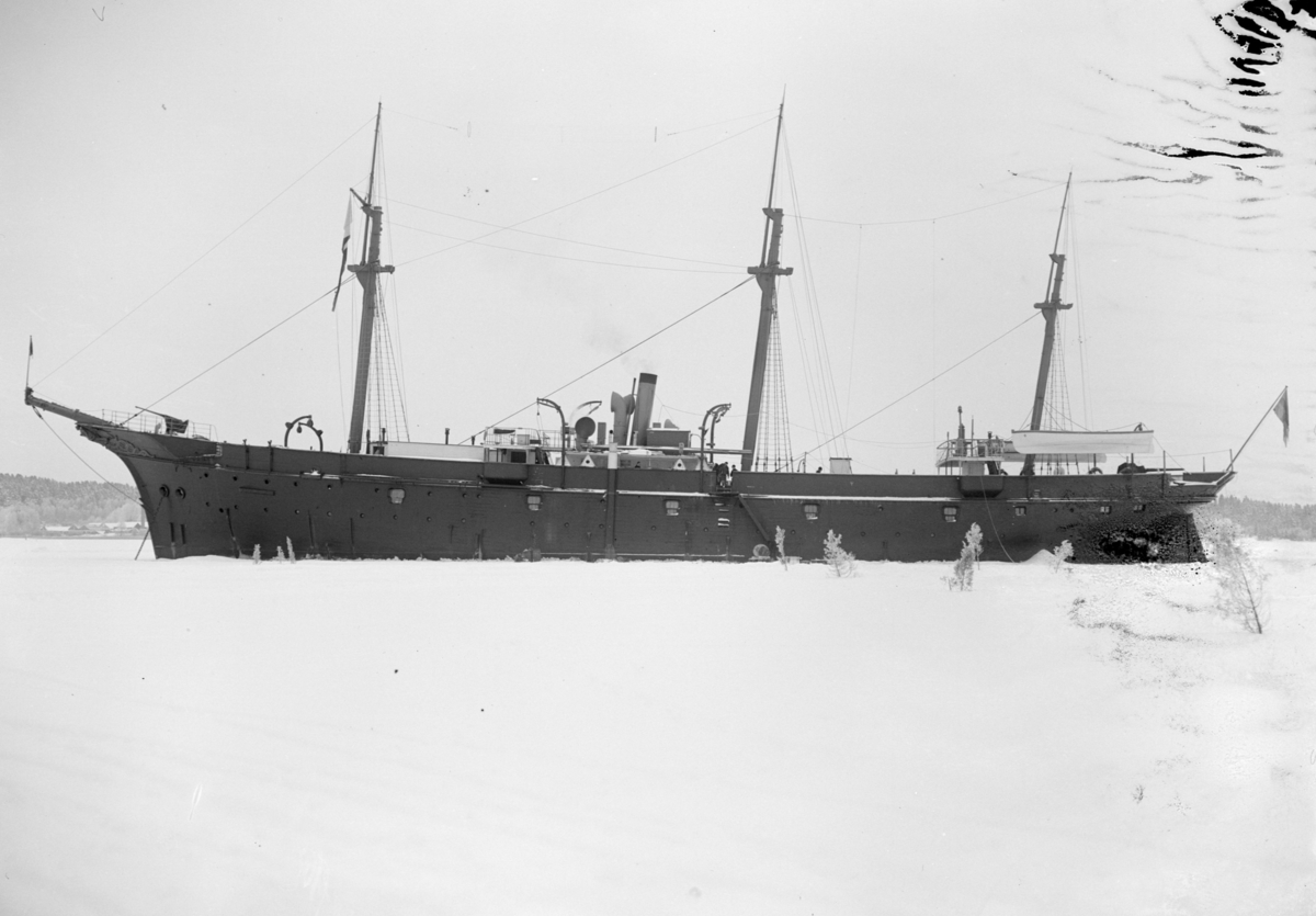Logementsfartyget Freja vid Hägernäs, vintern 1923. Vy från sidan