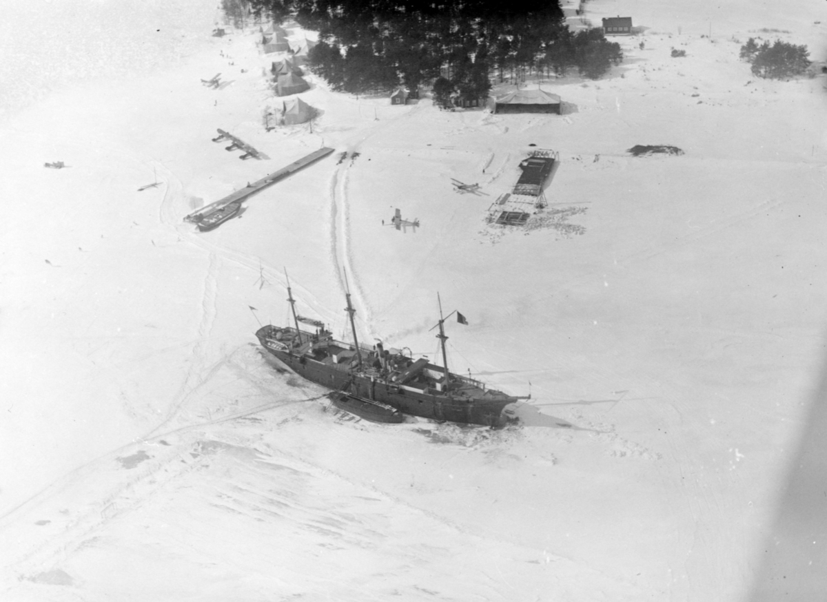 Flygbild av F 2 Roslagens flygflottilj, 1927. Krigsfartyg förankrat och flygplan på isen. Hangarer och brygga.