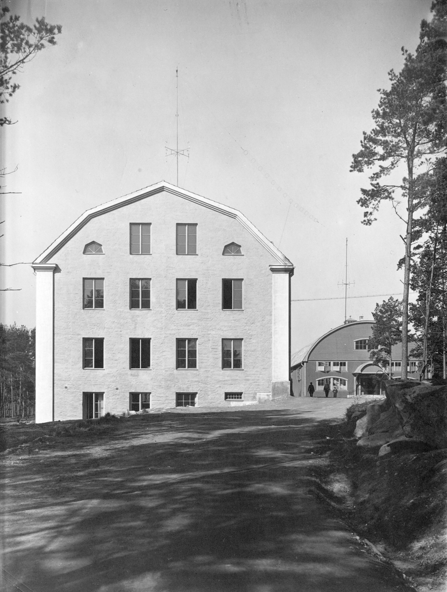 Kanslibyggnad och gymnastikhall på F 2 Roslagens flygflottilj sett från gavel, 1931.