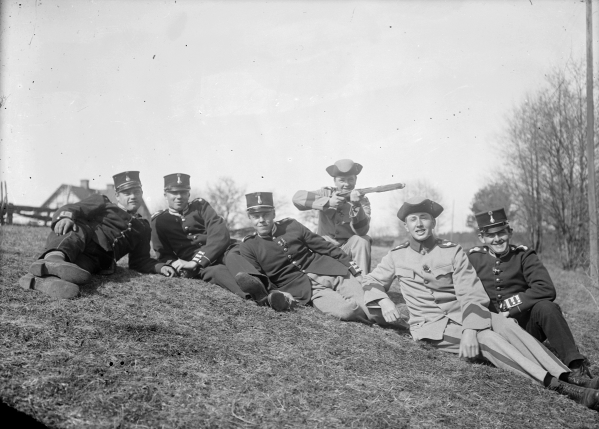 Grupporträtt. Sex armésoldater från I 4 och / eller I 5 regemente sitter i en backe. En av männen lägger an en träpinne som ett låtsasgevär.