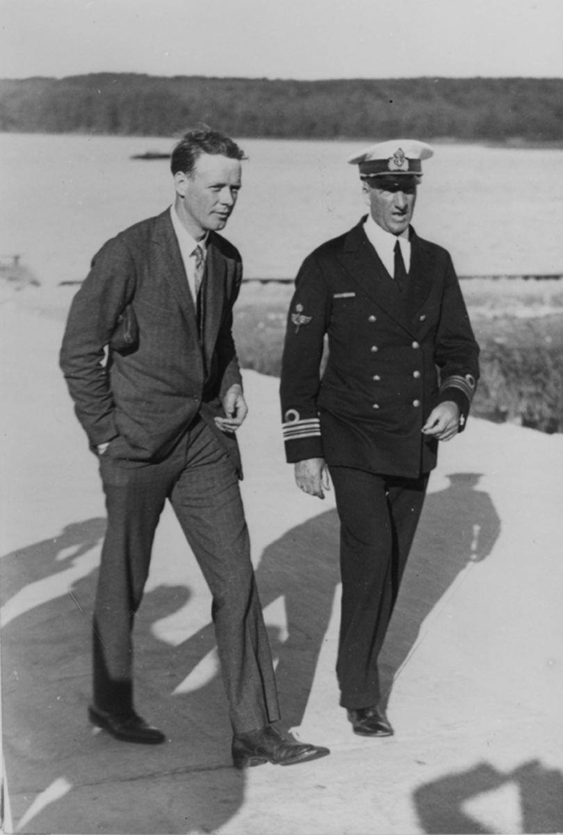 Charles Lindbergh på besök på F 2 Roslagens flygflottilj, 1933. Lindbergh och Arvid Flory i samtal.