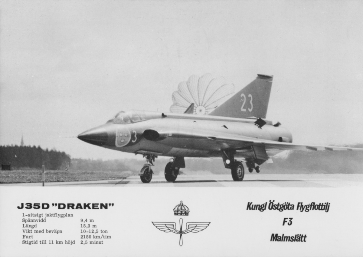 Vykort av J 35 D från F 3 Malmen på landningsbana med . Märkt 'J 35D 'Draken' Kungl Östgöta Flygflottilj F 3 Malmslätt' .