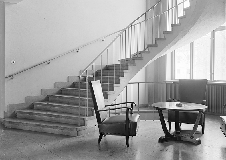 Kanslihuset med stora trappan på F 3 Malmen, 1941. Interiör.
